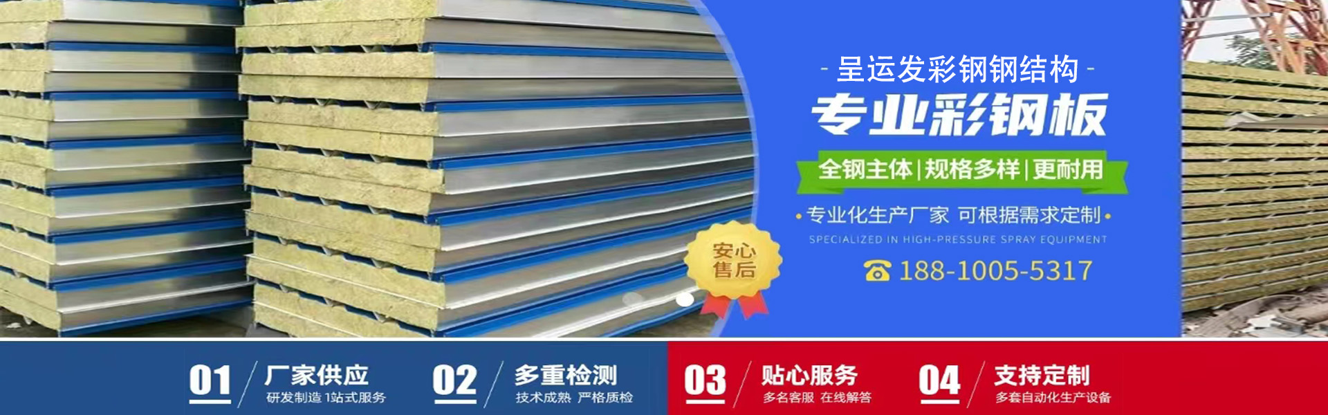生產(chǎn)銷(xiāo)售各種型號(hào)規(guī)格的:新型聚氨酯夾芯彩鋼復(fù)合板,新型聚氨酯封邊防火棉夾芯彩鋼復(fù)合板,防火巖棉夾芯彩鋼復(fù)合板及其它芯材夾芯彩鋼復(fù)合板,鋁鎂錳合金板,鈦鋅板,鋼筋桁架樓承板,彩鋼壓型板,壓型鋼板,組合樓板,彩鋼仿古裝飾瓦,彩鋼壓花復(fù)合裝飾板,彩鋼防雨罩,彩鋼廣告扣板,弧形彩鋼瓦,彩鋼凈化潔凈板,冷庫(kù)板,圍擋板,住人集裝箱房,彩鋼活動(dòng)房,集成房屋,C.Z型鋼,鋼結(jié)構(gòu)等產(chǎn)品及配套附件。